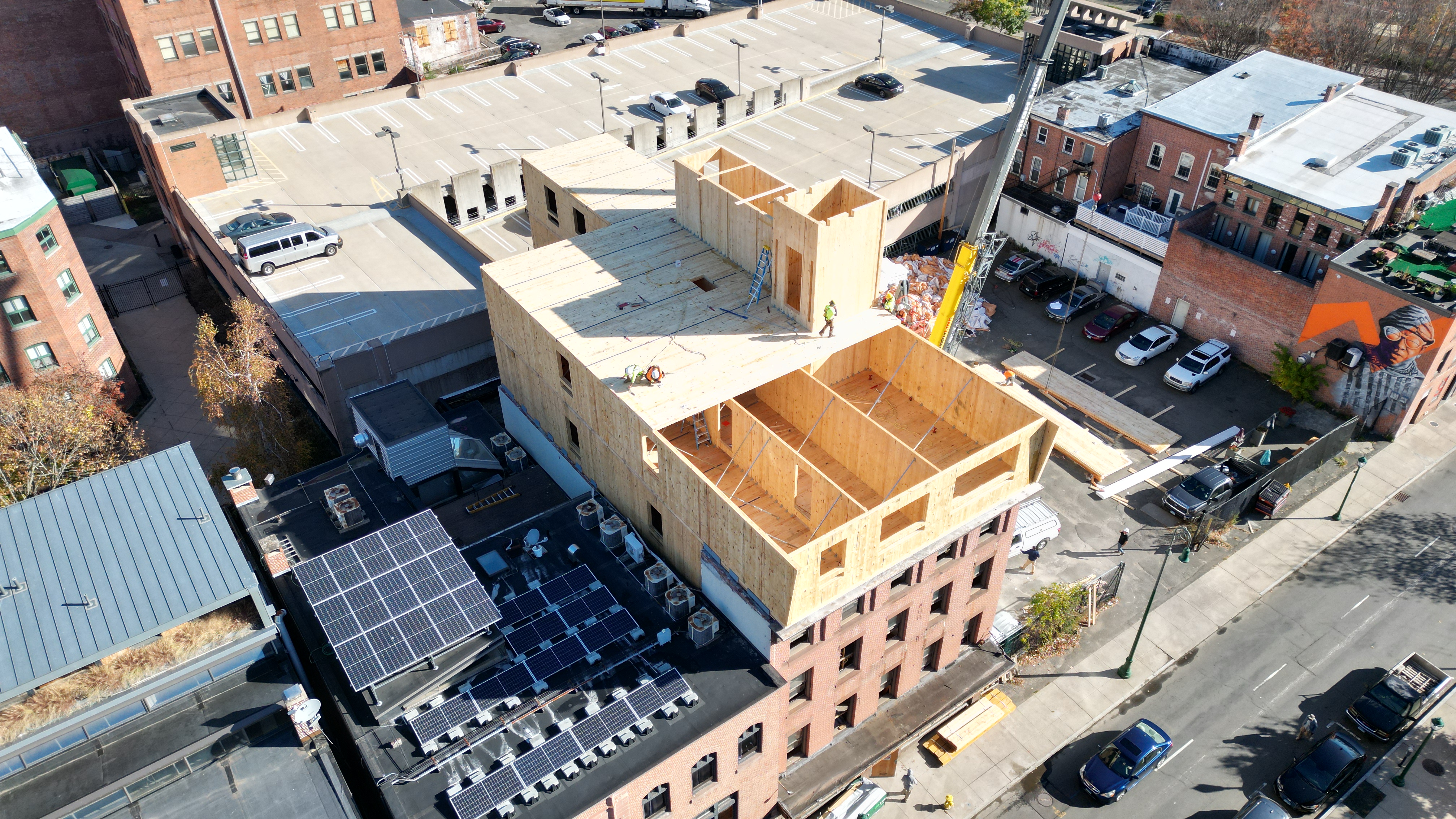 ACME Timber Lofts is a preservation, restoration and vertical expansion of an existing 3.5-story, 150-year-old, unreinforced masonry structure, via a new mass timber stair and elevator core and two story cross laminated timber (CLT) extension, with exposed CLT interior and exterior walls and ceilings. The renovated building is also designed to Passive House standards. In combination, mass timber and passive house strategies are the most progressive ways to decarbonize our buildings – to make them environmentally responsible, healthy, natural and durable. The five-story project will contain 18 residential apartments, ground-floor retail, basement gym, bike room, and trash room, and rooftop tenant amenity space and solar panels. Located at 33 Crown Street in the downtown Ninth Square Historic District, the ACME building served as the headquarters for the multi-generational ACME Furniture business and is located close to New Haven’s train stations, the Yale New Haven medical complex, Yale University and the City’s growing biotech center.